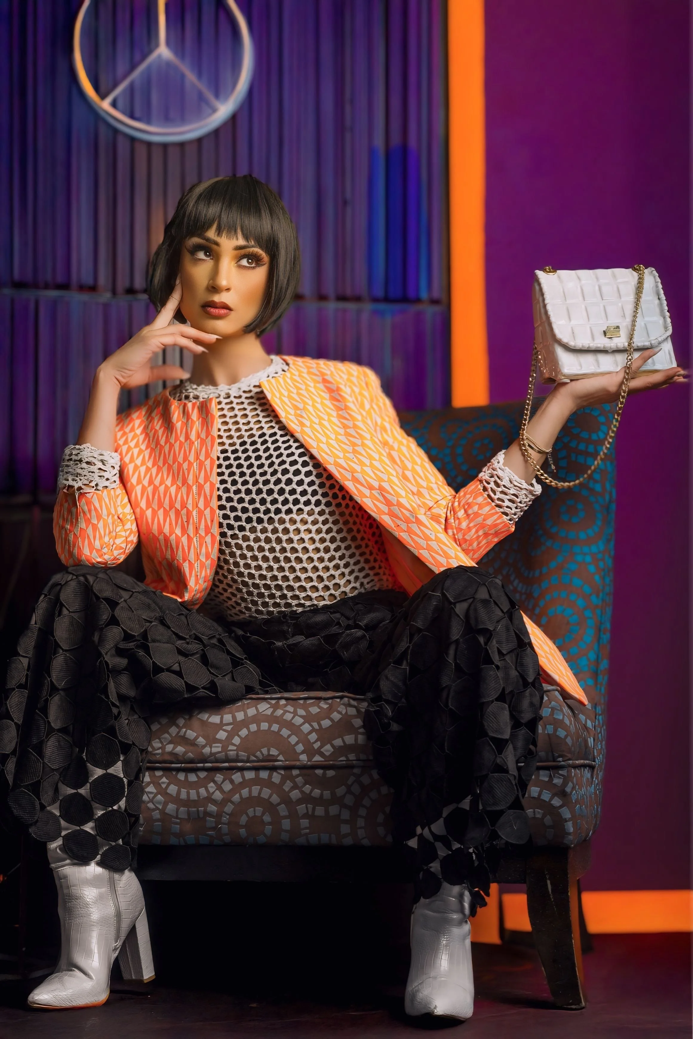 Cinematic lighting with clean lines. Graphic shapes and negative space. Bold color used intentionally. Skin retouched true-to-life. Chicago textures—steel, glass, river light—paired with couture details: pearls, mirrors, tailored silhouettes. I love the moment the performance drops and the person shows up.