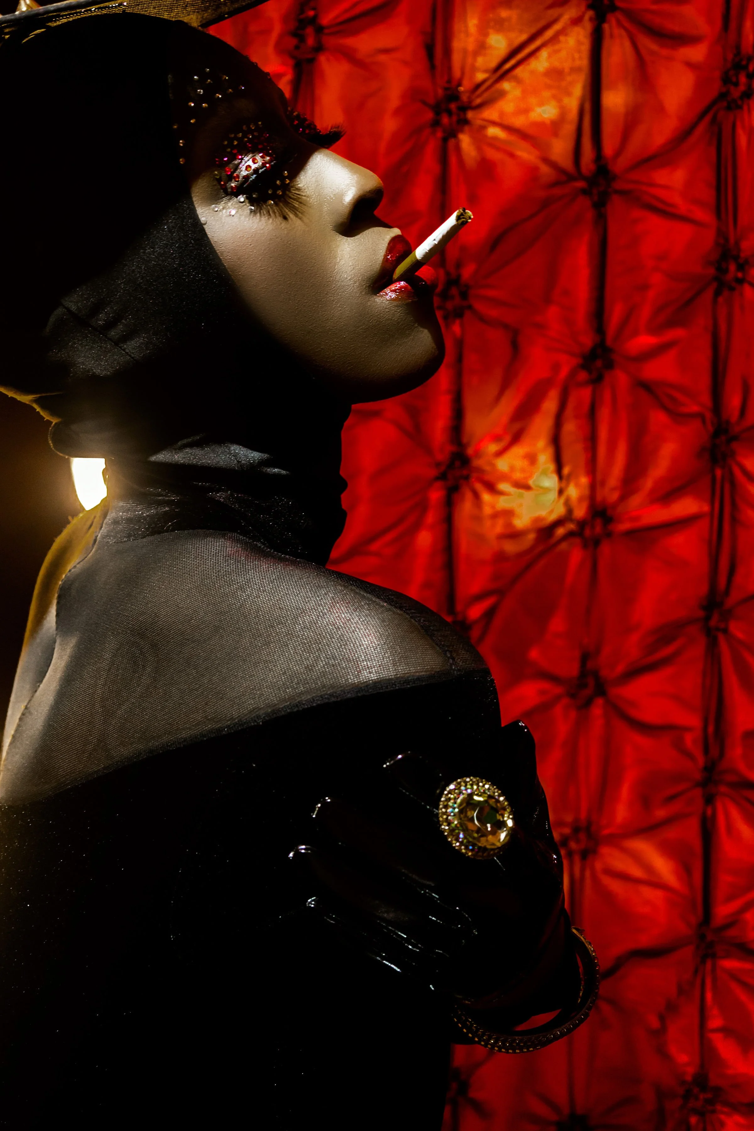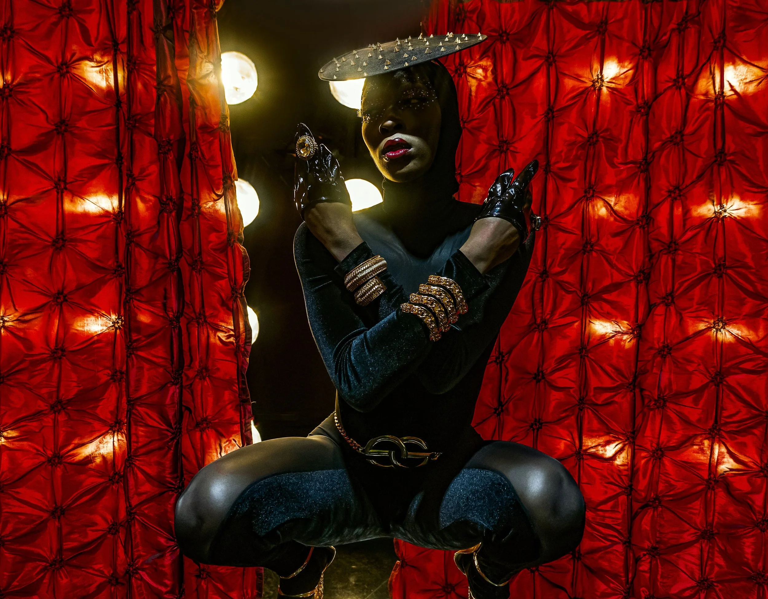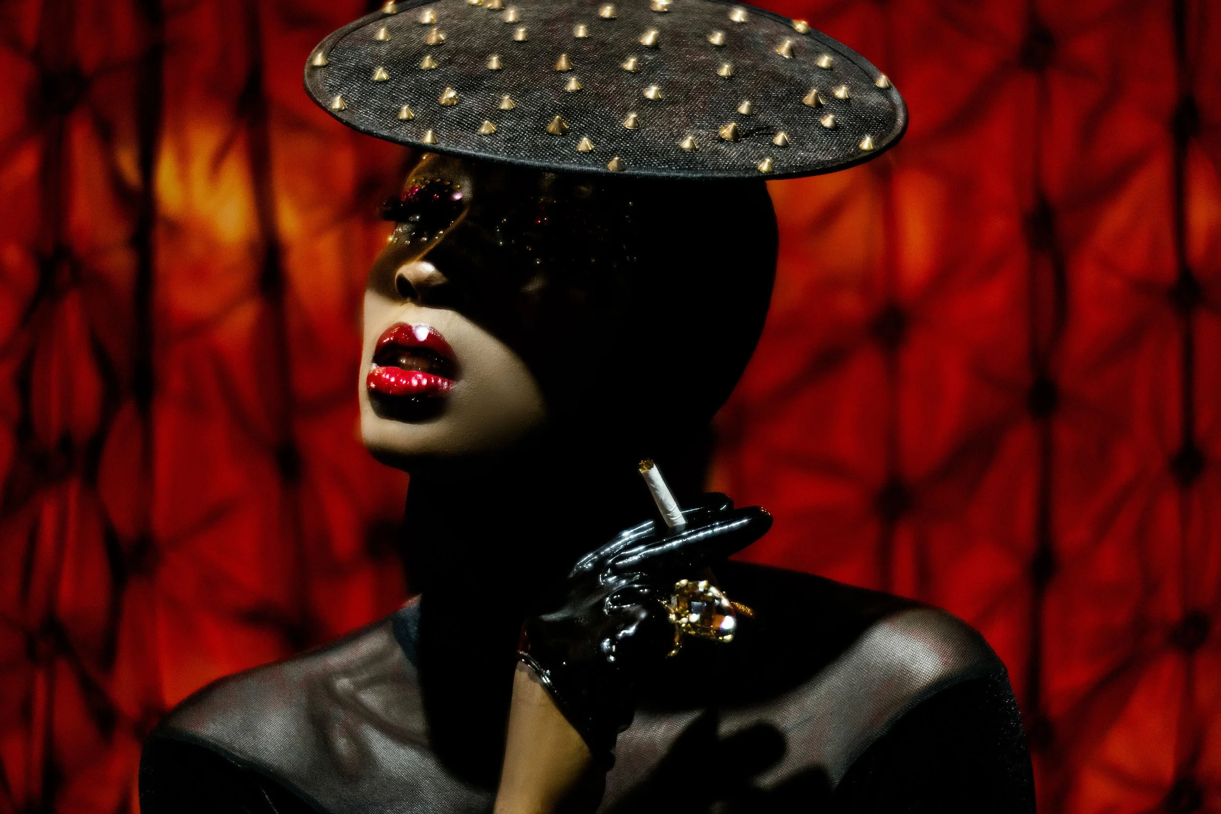 Step into a world where fashion meets fine art. This avant-garde editorial series blends dramatic lighting, sculptural styling, and bold textures to create imagery that commands attention. Shot in a Chicago luxury photography studio, the set features rich red drapery, studded accessories, and fluid bodysuits — a visual homage to vintage glamour with a modern, high-fashion twist.